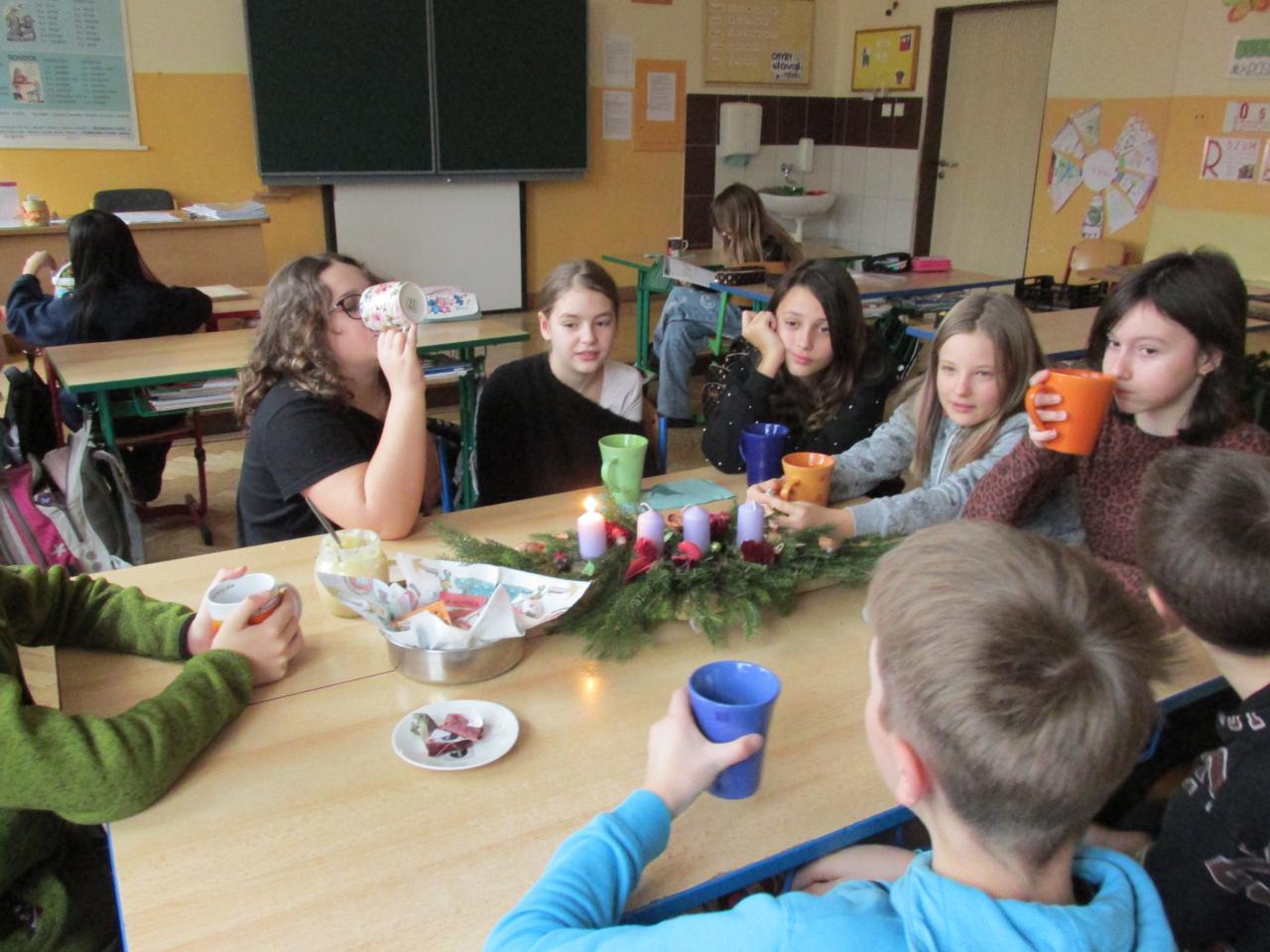 Přišel i Mikuláš, ochutnali jsme horkou čokoládu, zahřáli se horkým čajem s medem, vyzdobili jsme okna, domů jsme si přinesli andílka, vánoční ozdoby a nakonec jsme si společně popřáli krásné Vánoce a rozešli se do svých domovů, kde za námi přijde ten opravdový Ježíšek. A tak hodně štěstí jsme přišli všem přát, ať hodní zlé přelstí, ať můžem se smát. To k Vánocům patří tak jak děda Mráz, jak svíčky a kapři, jak víra, co je v nás.