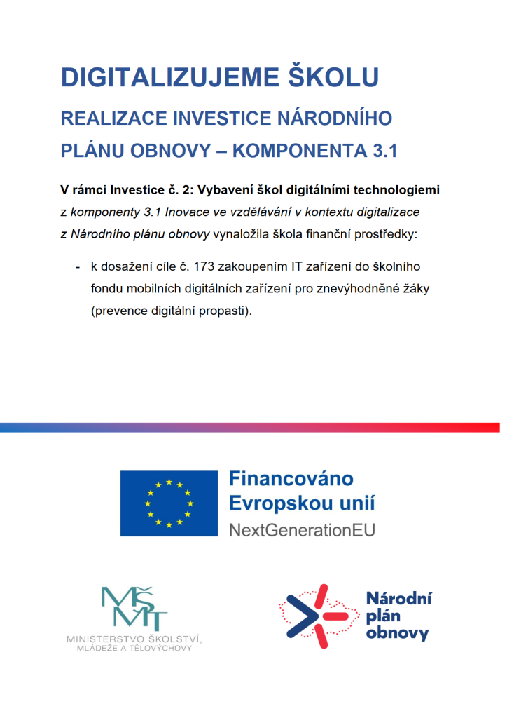 V rámci Investice č. 2 Vybavení škol digitálními technologiemi z komponenty 3.1 Inovace ve vzdělávání v kontextu digitalizace z Národního plánu obnovy vynaložila škola finanční prostředky k dosažení cíle č. 173 zakoupením IT zařízení do školního fondu mobilních digitálních zařízení pro znevýhodněné žáky (prevence digitální propasti).